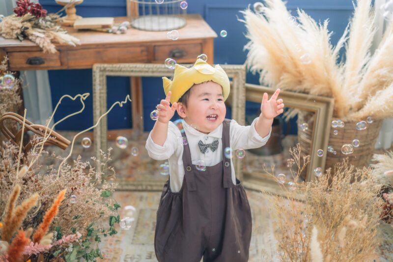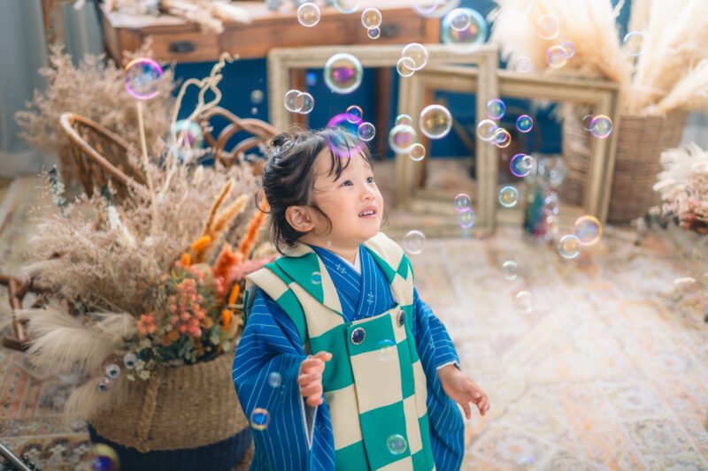 ご家族にシャボン玉を飛ばすのを協力していただきながら撮影します。